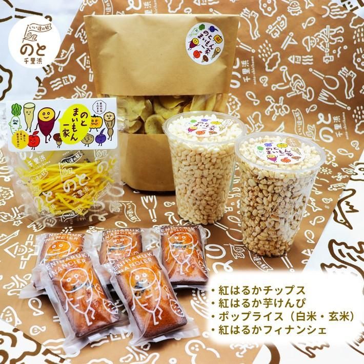 原材料 | ・紅はるかチップス:石川県産紅はるか、米油、塩(能登産) ・紅はるか芋けんぴ:石川県産紅はるか、米油、砂糖、水あめ ・ポップライス(白米・玄米):米(石川県産)、砂糖 ・紅はるかフィナンシェ:砂糖、卵白、バター、アーモンド、小麦粉、コーンスターチ、はちみつ、さつまいも、塩、ごま、ラム酒、果糖ブドウ糖液糖、甘藷、香料、着色料(パーム油カロチン)、増粘多糖類(一部に卵・乳・小麦・ごま・アーモンドを含む) | |||||||